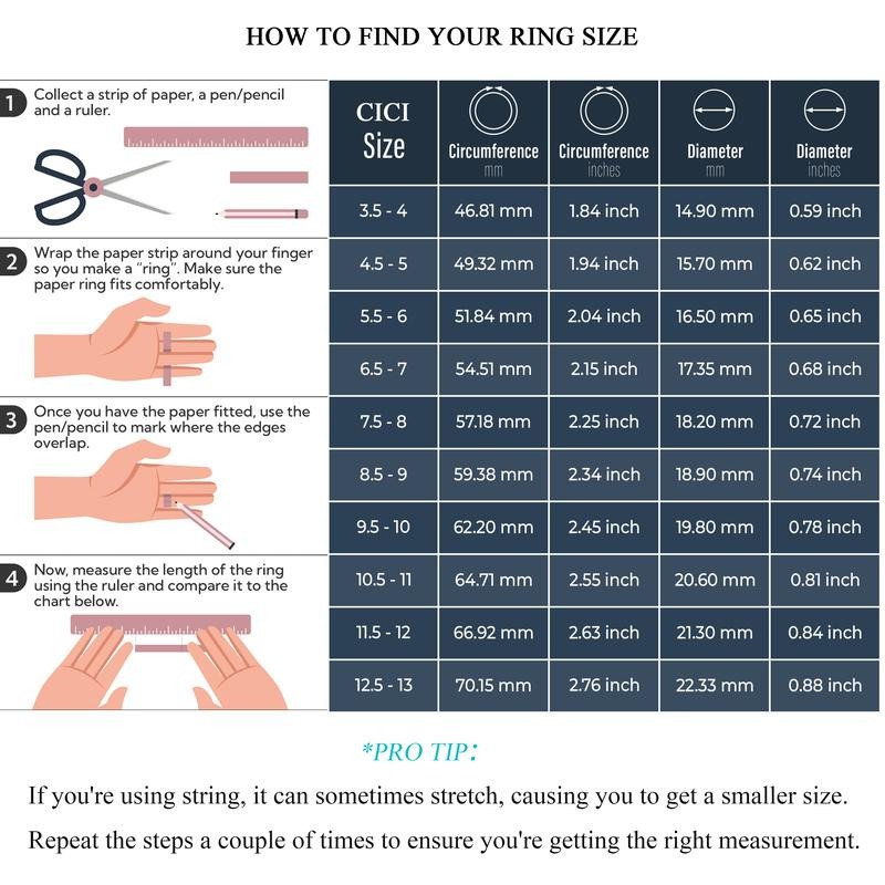 Choose from a range of popular US sizes to find your ideal fit. If you’re unsure, simply measure your finger using a strip of paper or string and compare the circumference or diameter to the size chart provided in the image. For in-between measurements, we recommend sizing up for comfort.