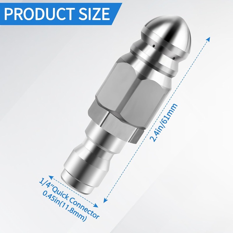 Equipped with a standard 1/4-inch quick-connect plug, this sewer jetter nozzle allows fast, tool-free connection to most high-pressure washers and jetter hoses. Universal compatibility simplifies setup and improves workflow efficiency for drain cleaning tasks.