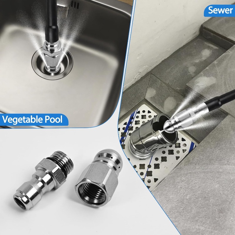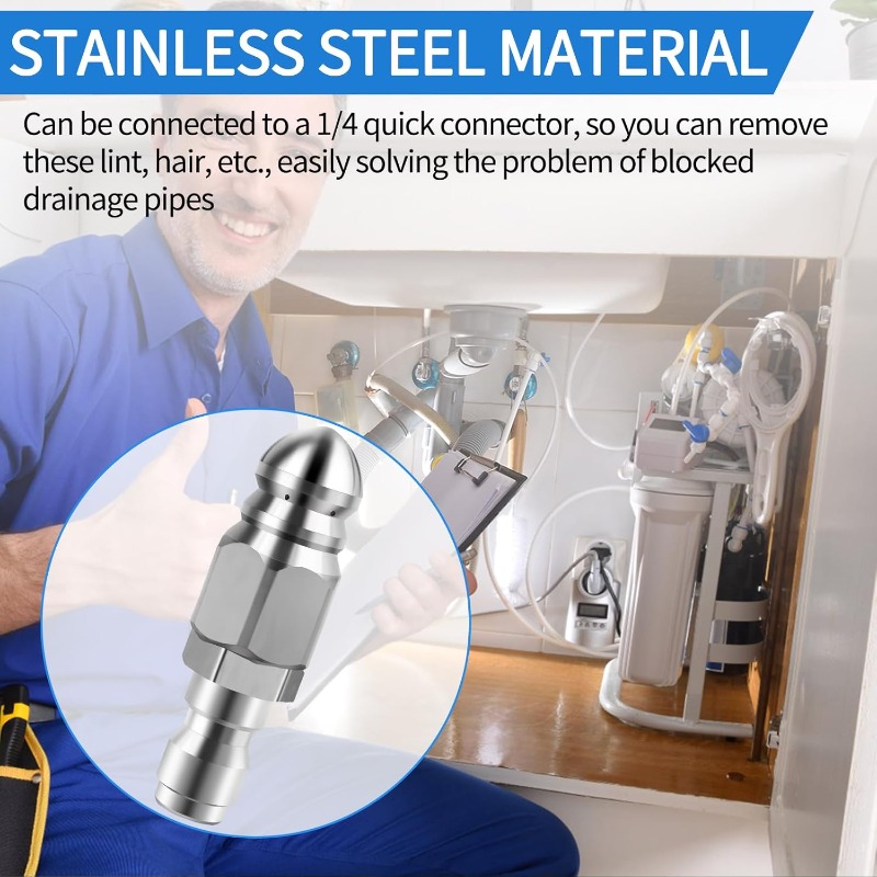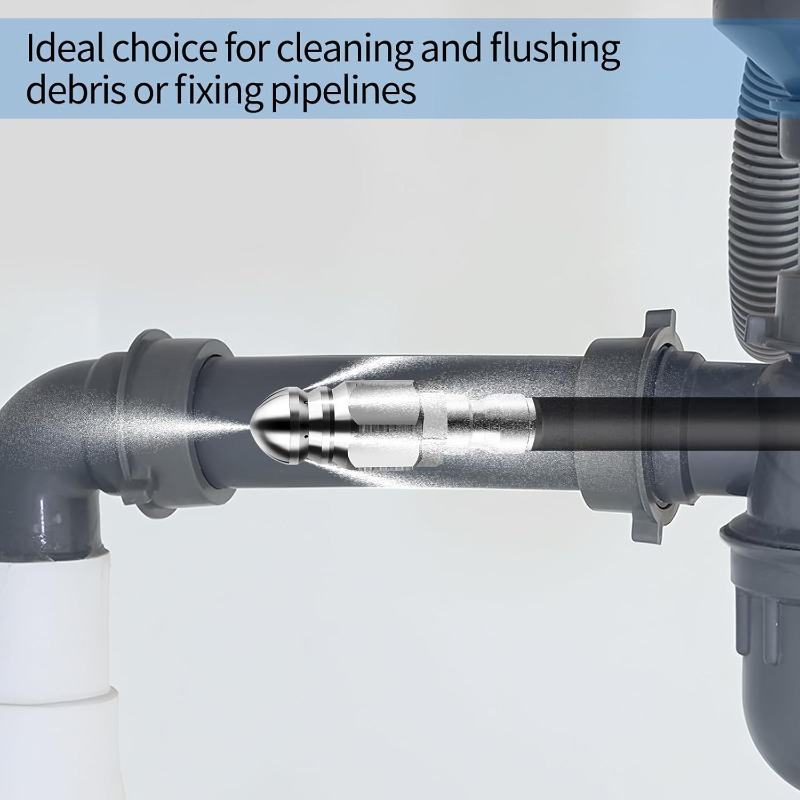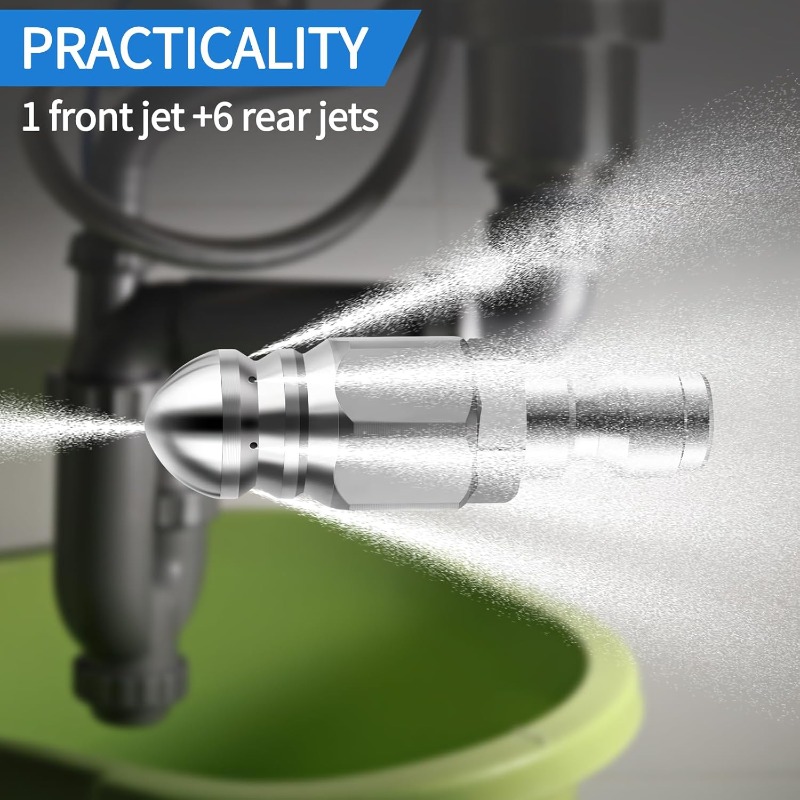 Ideal for indoor and outdoor applications, this nozzle effectively cleans toilets, floor drains, washing machine pipes, and sewer lines. When paired with a pressure washer, it generates a rotating water jet that removes hardened scale and residue from pipe walls—perfect for property maintenance, sanitation services, and home use.