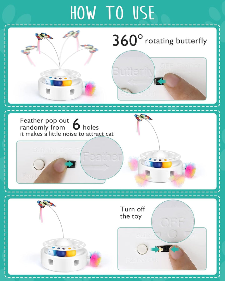 The 360° rotating butterfly mimics a real flying butterfly's movement, engaging your cat’s natural hunting instincts. Keep your cat entertained and away from boredom with this captivating toy.