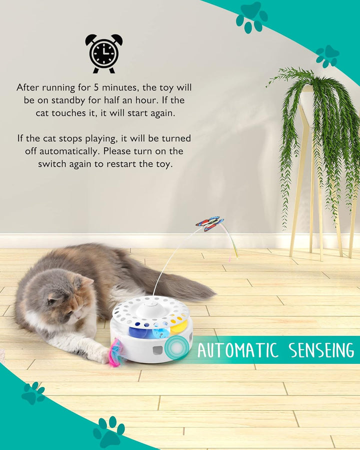 Equipped with a built-in sensor switch, the toy starts and stops automatically based on your cat's touch. After 5 minutes of play, it enters standby mode and reactivates when your cat interacts with it again.