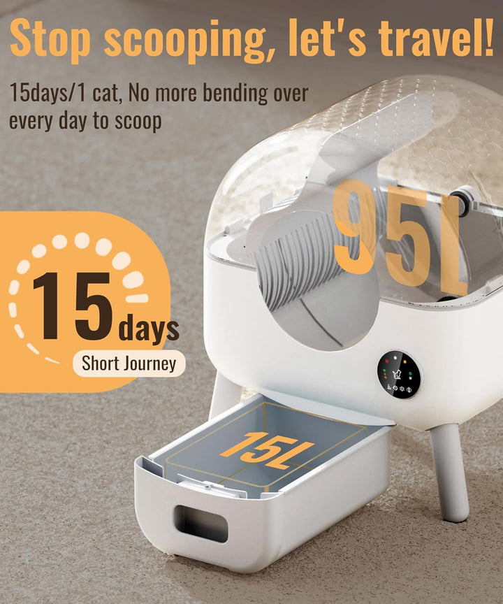 Large Capacity: Features a 95L max roller capacity, suitable for cats from 2.2 lbs to 33 lbs. The 15L waste bin supports up to 15 days of use, ideal for long trips. Compatible with any type of litter, perfect for single or multiple cats.