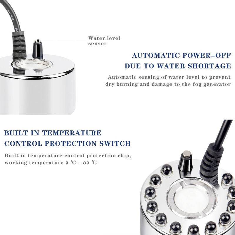 Using advanced ultrasonic atomization technology, this mist maker generates thick, continuous fog within seconds. It adds dramatic mist to indoor fountains, ponds, rockeries, and water landscapes, creating a magical and decorative atmosphere. Water consumption is approximately 500ml per hour, and clean water is recommended for best performance.