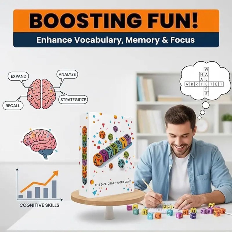 This dice word game enhances quick thinking, spelling skills, and cognitive flexibility. Great for kids, adults, and seniors—anyone who loves a fun brain workout! Expands vocabulary as players rapidly form words under pressure.